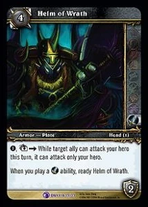 1, ↓ → While target ally can attack your hero this turn, it can attack only your hero. When you play a Warrior ability, ready Helm of Wrath. |