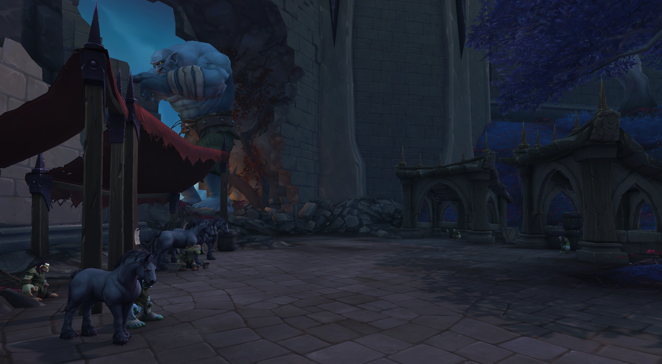The Hole in the Wall is located at [41, 47] in the southwest segment of the Court of the Harvesters and is accessible through a titular hole in the hall made by a biggun Crunchfoot the Clumsy through the Charred Ramparts and through an elevator from Darkwall Tower. The dredger Mims serves as innkeeper.