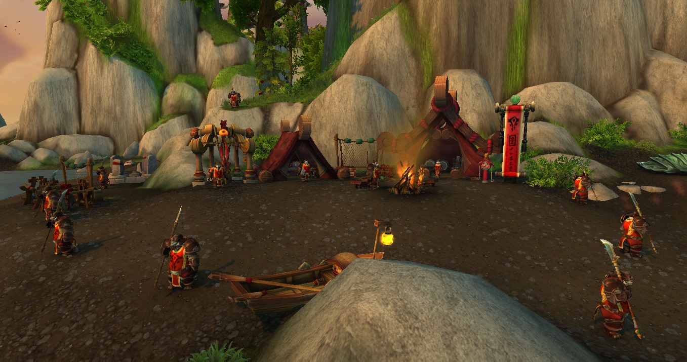 Huojin Landing [22, 40] is the Horde's beachhead on the Timeless Isle. Situated at the northern end of the Timeless Shore, the Misty Strand is found immediately to the northeast, the Celestial Court is inland to the southeast, and the Tushui Landing is found at the southern end of the shore to the south.