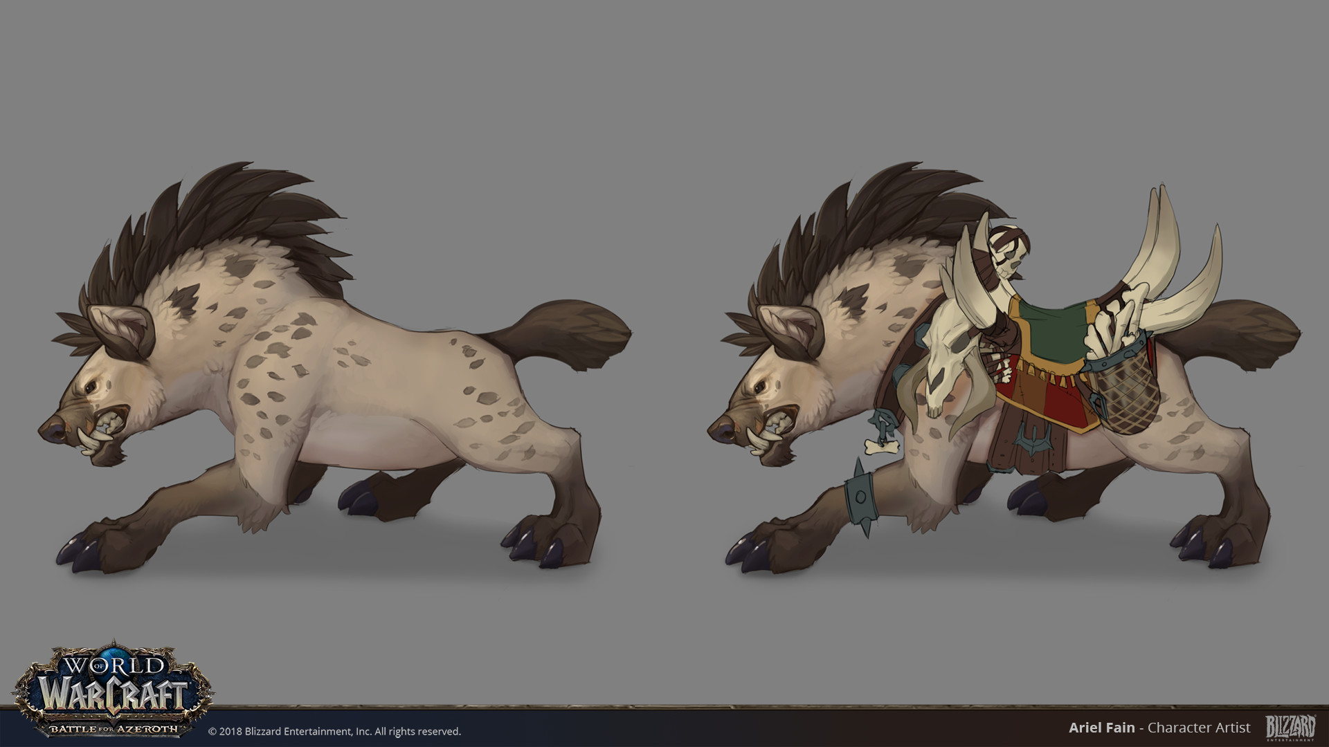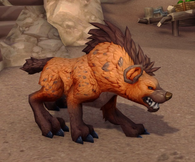 Centaur hunters in the Barrens and Desolace often keep them as pets, while they also serve as mounts for Uldum's desert pygmies and Vol'dun's vulpera. Hyenas are skinnable. They are found in the Barrens, Desolace, Tanaris, Blasted Lands, Dragonblight, Uldum, Townlong Steppes, and Vol'dun.