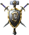 The Icon of Courage is the racial icon of the humans, and symbolizes the courage and tenacity of humanity. The crest features a shield emblazoned with the symbol of the fallen Kingdom of Lordaeron over a pair of crossed swords and a warhammer accented with a golden lion's head, representing courage and the Kingdom of Stormwind.