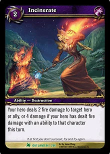 | Rules | Your hero deals 2 fire damage to target hero or ally, 4 damage if your hero has dealt fire damage with an ability to that character this turn. |