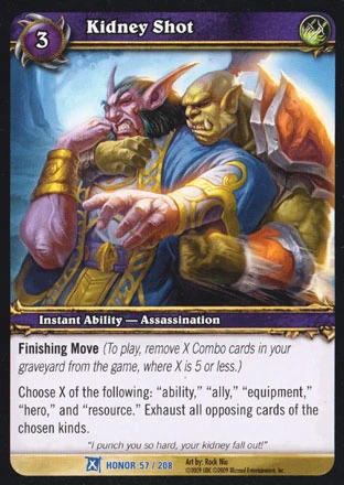 Finishing Move Choose X of the following: "ability," "ally," "equipment," "hero," and "resource." Exhaust all opposing cards of the chosen kinds. |