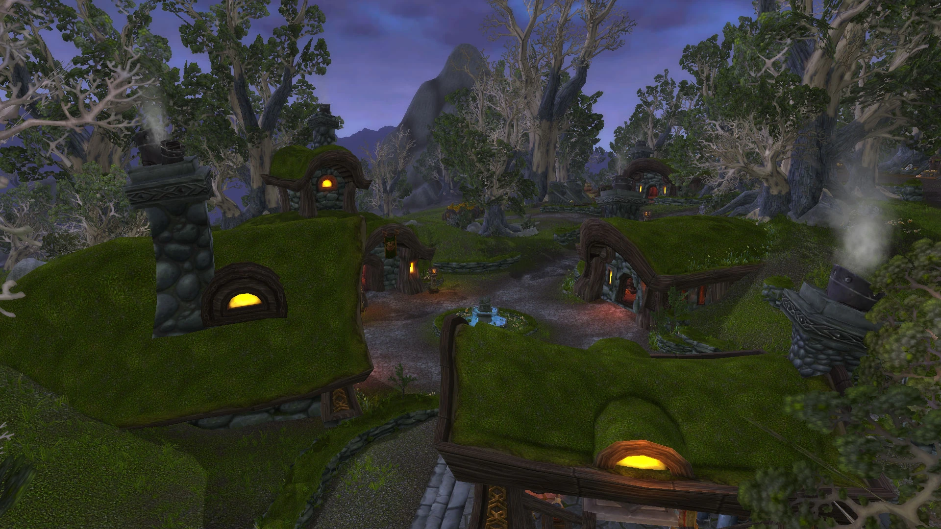 The village features typical Wildhammer architecture, with stone houses chiseled into the ground itself. Most of these are clustered around a central square with a fountain. The village also has an aviary area with the flight master, roosts and many hatchlings frolicking around. The Wildhammer honor their dead heroes here before burying them with their gryphons atop Mount Thunderstrike.[1]