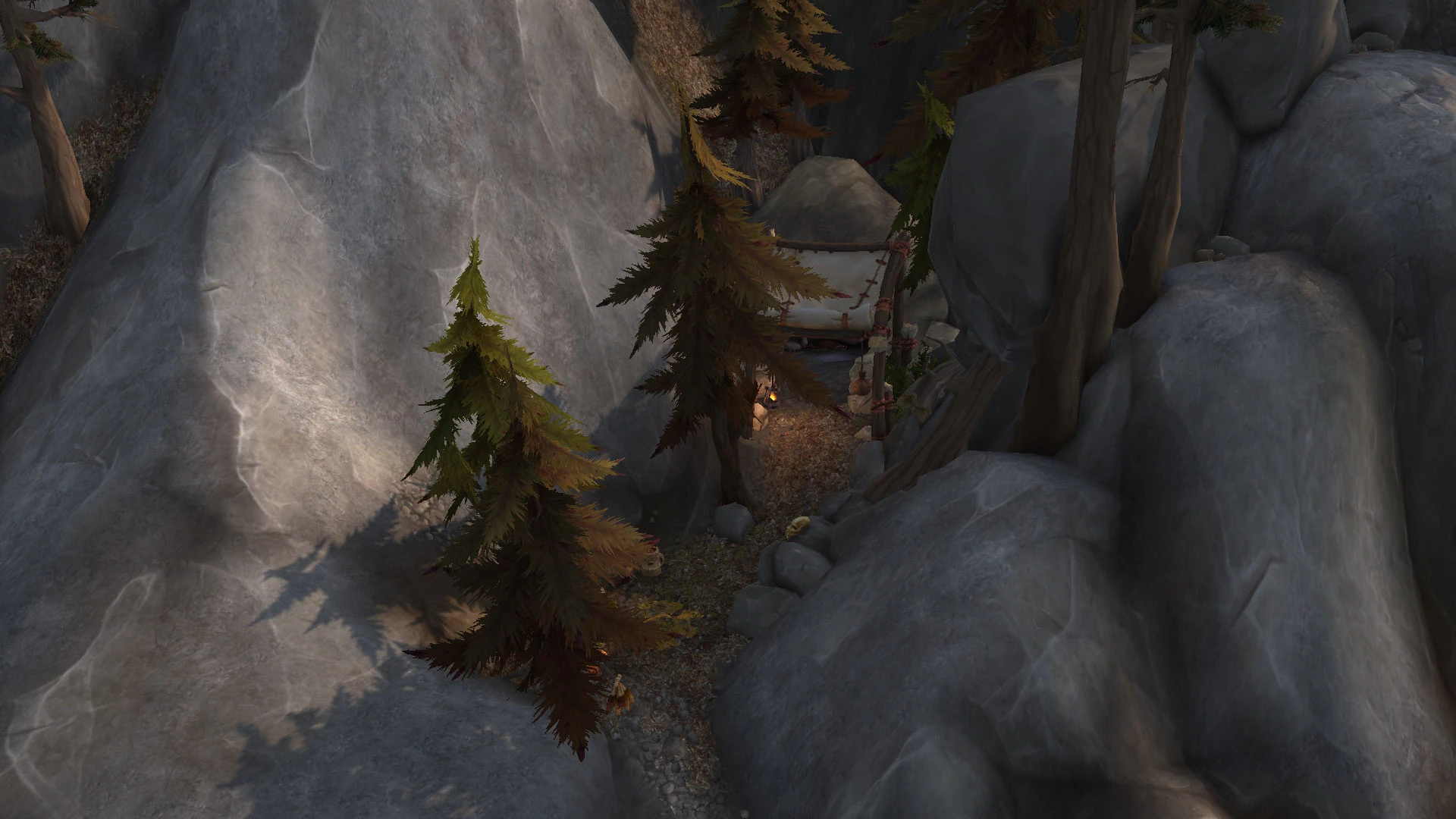 - [55, 38] northeast of Skyhorn (the nearest flight path) on the northeastern face of Heymanhoof Slope in Highmountain. On foot, the trailhead up the slope begins at [53, 35] in the Haglands. Roughly 3/4 of the way up, stop at [55.2, 38.3] and look down. Search for a tarp flanked by trees covering the mouth of a small cave. The orb is not in the obvious cave! Look to the right (south) of the main cave mouth under the tarp for a second, smaller cave hidden behind some trees. The orb is in the skull at the back of the cave.