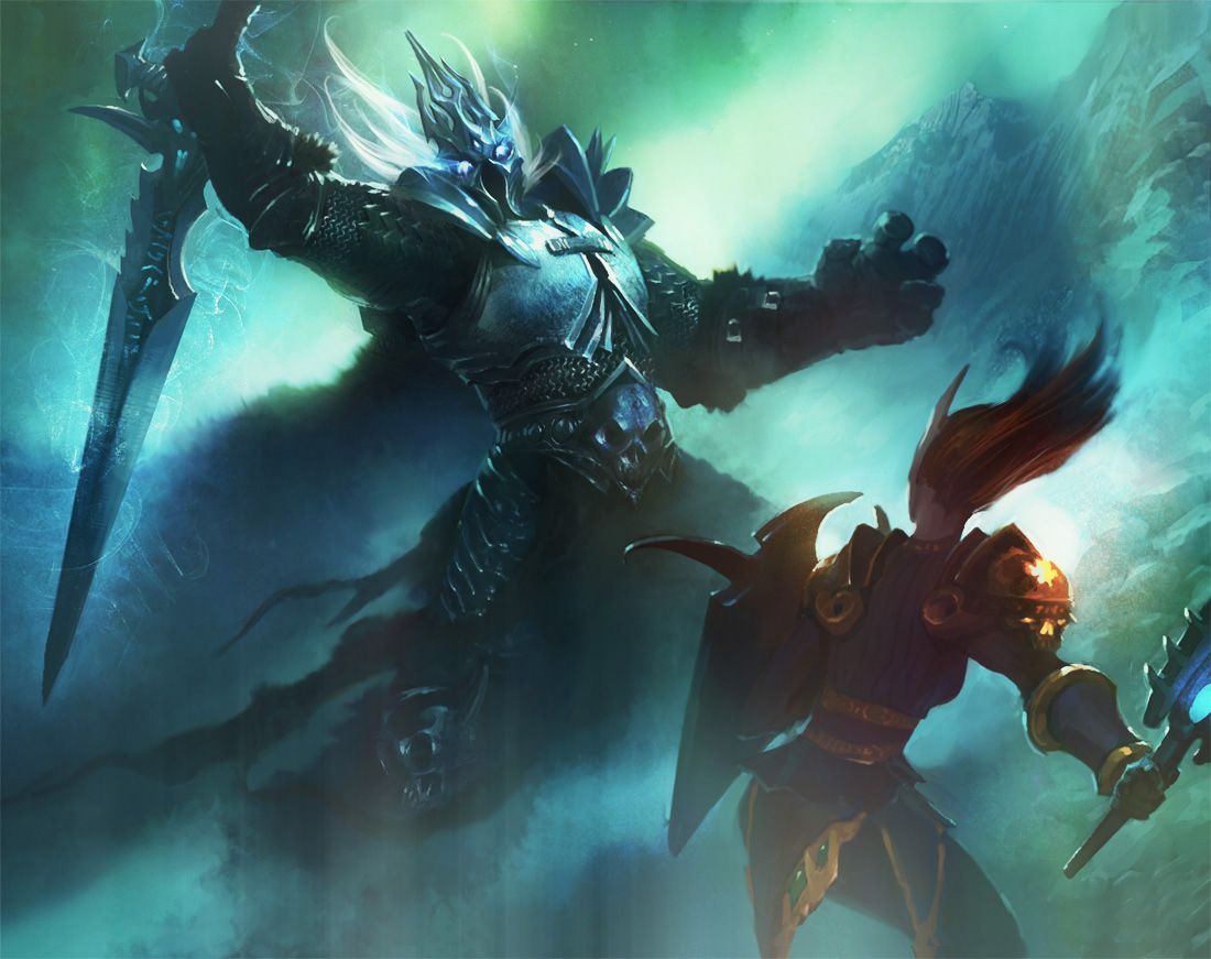 Arthas fighting Illidan at the Frozen Throne.