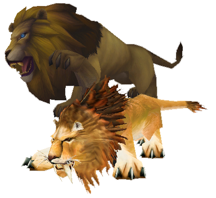 Lions are large, carnivorous cats. They are common predatory beasts found mainly in central Kalimdor, while some can be found in the Eastern Kingdoms and even in Outland. A variety of lions known as mountain lions usually roam the warm mountain regions and plains of high terrain. As predators, lions tend to be hostile and will attack players who approach them.
