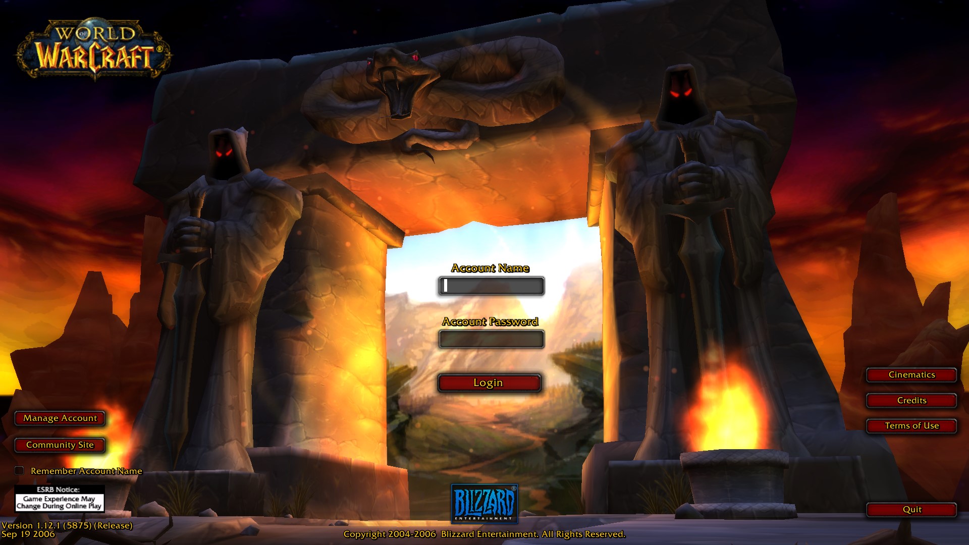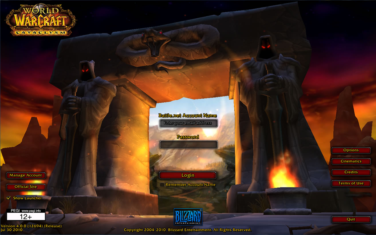 - The Cataclysm login screen is so far the only one that displayed a still-image while the rest of the game files finish downloading.[2]