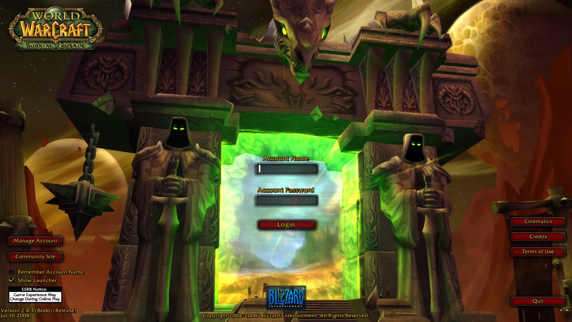 - Warlords of Draenor marked the third login screen out of eight to feature the Dark Portal, making it the most common theme so far. The second most common is tied between dragons, featured in both the Wrath of the Lich King and Cataclysm screens, and Icecrown Citadel, featured in the login screens for Wrath of the Lich King and Shadowlands.
