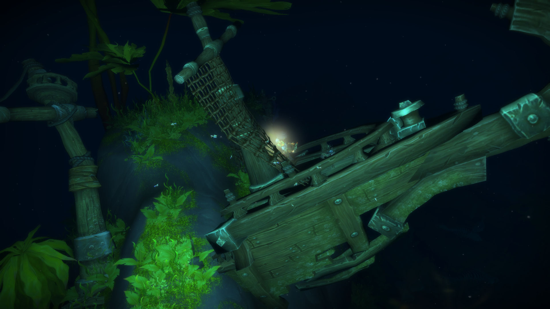 The crew of the ships are cursed with undeath due to a forbidden artifact one of the vessels carried: A Cursed Eye of Paleth, a blackened orb hidden deep in the cargo hold of the Intrepid, kept locked away by its greedy commander, Captain Halyndor.[6] Its curse affects anyone trying to locate the orb, transforming the living temporarily into an illusionary undead form and weakening their spirits. The ghost of First Mate Snellig can be found on the nearby shore. He appears to be the only undead crew member that has retained his sanity.