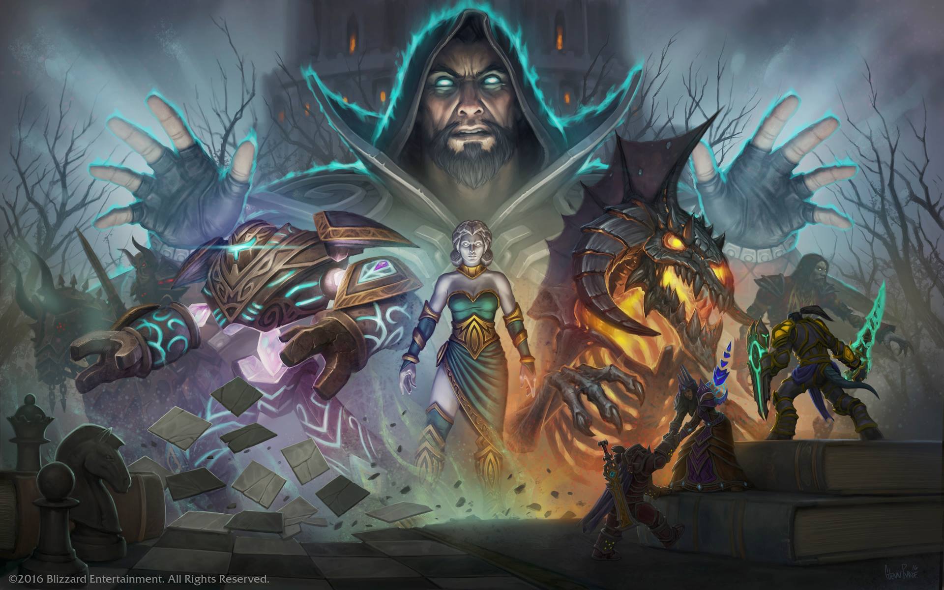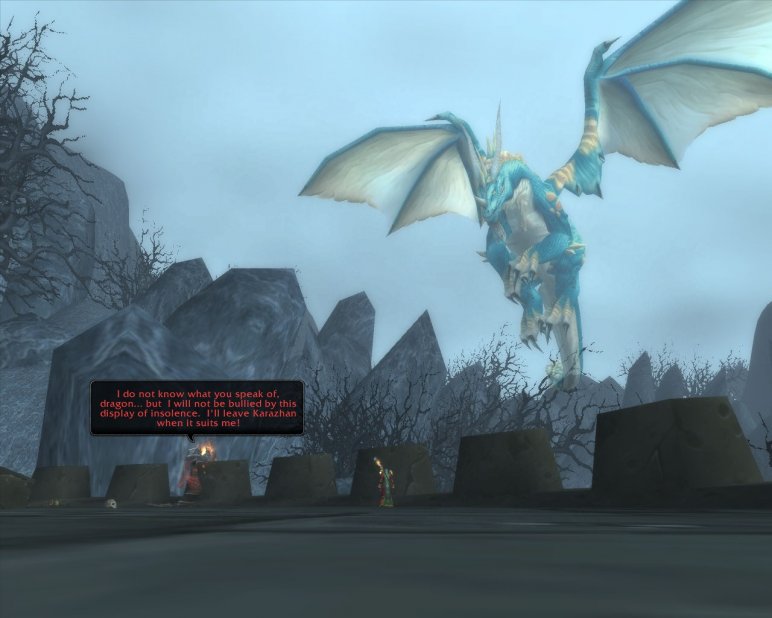 He shows up twice more in his old tower of Karazhan in Deadwind Pass which has been abandoned since Medivh's death at the hands of Khadgar and Lothar, shortly before the end of the First War. An "Echo of Medivh" is seen where players play a game of chess against him in the Gamesman's Hall, and an "Image of Medivh" is seen in a flashback on the Master's Terrace fighting off the blue dragon Arcanagos.