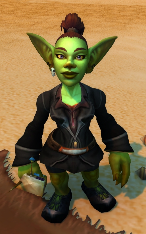 Megs Dreadshredder is a goblin quest giver found in many locations of Tanaris. Megs was also part of the goblin starting experience as the Kajaro Trading Company marketing rep on Bilgewater Port.