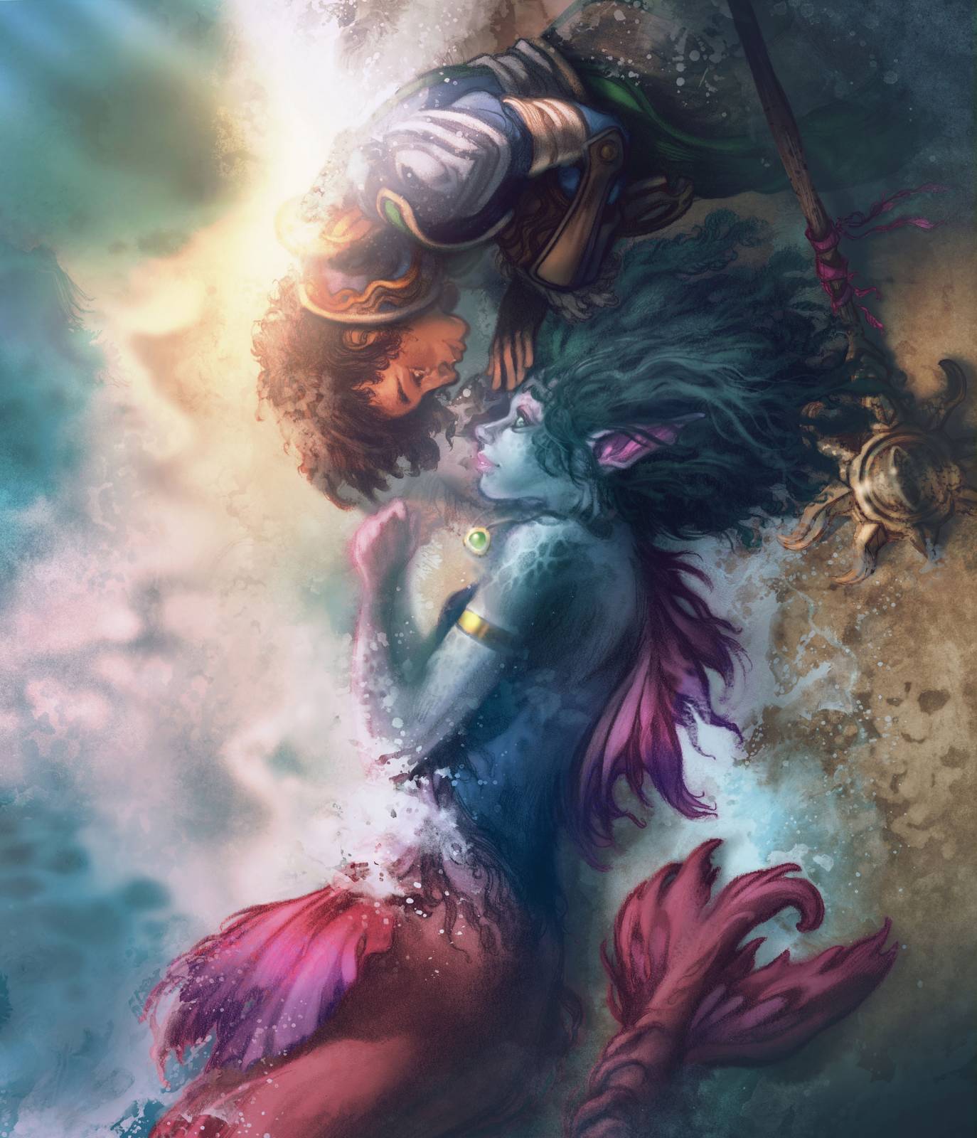 One day a great storm came to Boralus, threatening to destroy the town. Ery and the other tidesages traveled to the river's mouth to try to hold back the water, but they faltered one by one until only Ery was left. Halia vowed to help her beloved by constructing a wall of rocks and mud on the seabed, a task she poured more and more of herself into even though the effort threatened to kill her. This brave intention caused a crest of the Tidemother's magic to sweep through the harbor, jolting all of Halia's sisters awake. They shouted at their sister to stop, for while they were not frightened by the storm or concerned for Boralus, they had never conceived that one of their own might pay a price for it. After failing to convince Halia, they threw themselves into her labor and were soon joined by other mermaids who did the same. Together they built the wall higher and higher until it breached the surface and continued to rise under Ery's feet. Some of the oldest mermaids died and turned into bubbles in the process, their power spent, but the rest didn't stop working until the wall towered over the harbor. At this point, Ery collapsed from exhaustion and fell into the harbor. Without her power, the waves crashed into the wall, but it held steady. The crew of the Windward—who had watched the events unfold—brought Halia and the seemingly-dead Ery aboard their ship. Halia slit her beloved's feet with a knife and then jumped back into the harbor with her. There, the Mother transformed Ery into a mermaid, allowing her and Halia to be together at last.