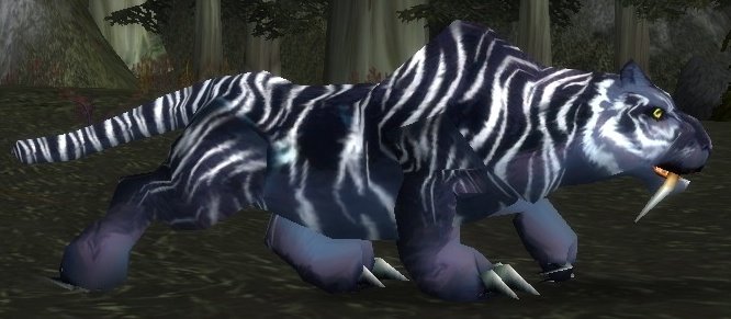 Moonstalkers are saber cats found in Darkshore. A characteristic of the moonstalkers is the striped, black-colored fur. Their coloration attracts some hunters to tame them, as it is exclusive to the moonstalkers and the Blackwind Sabercats found in the mountains of Skettis.