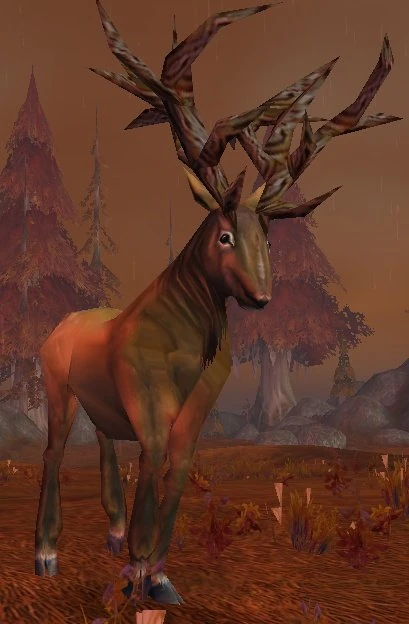Mosshoof Coursers are stags found in Azshara on the north-eastern landmass[52.7, 27.5] and south-eastern landmass[34.3, 64.7]. Originally hailing from Felwood, they chose to leave that place when it was corrupted. They are naturally resistant to disease and poison.[1] They wear the mightiest antlers in the known lands.[2]