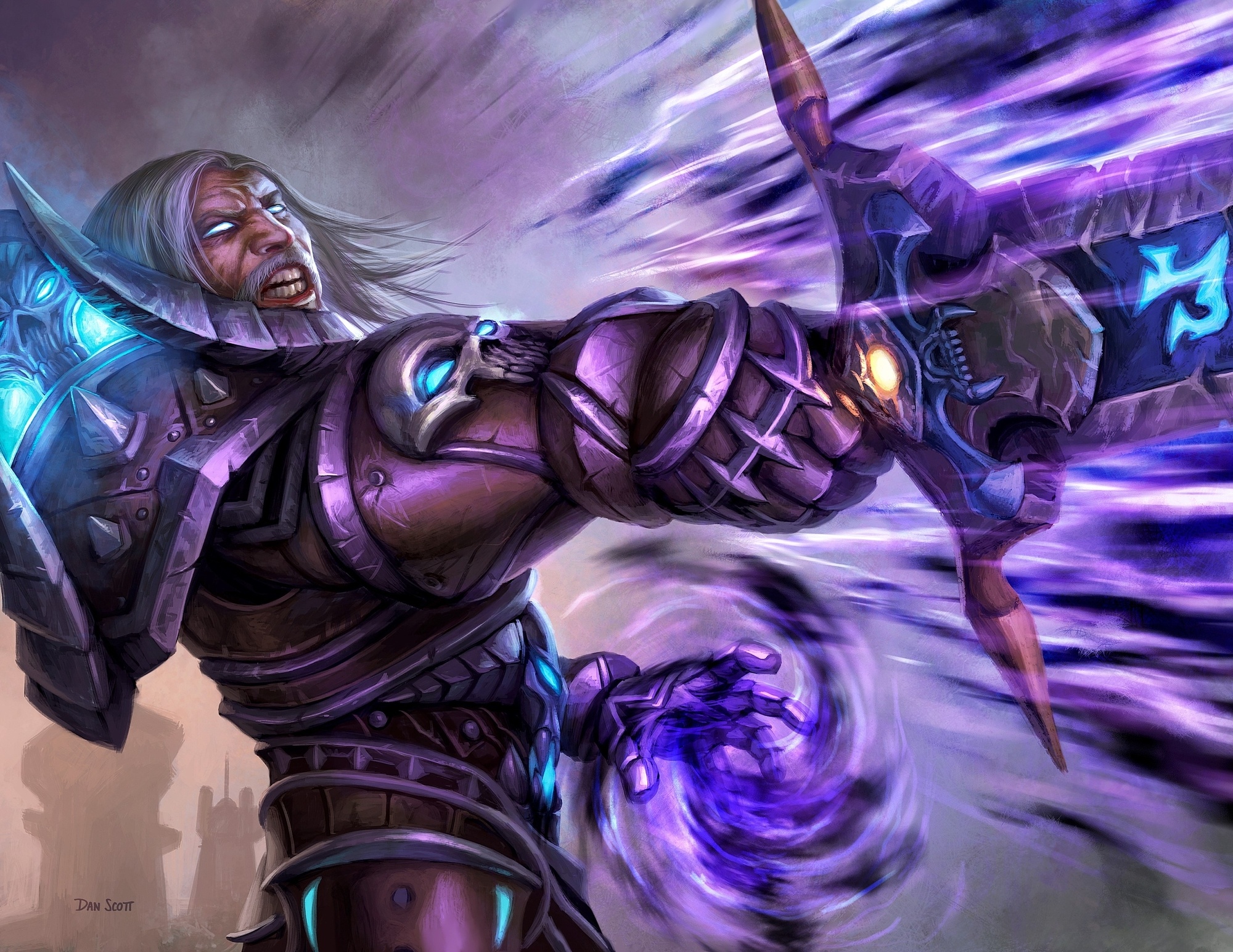The modern death knights were the former champions of the Scourge. While they managed to free themselves from the Lich King’s grasp, some death knights still embody the ever-corrupting nature of the Scourge plague that once threatened to consume Azeroth. They fortify their bodies and drain life energy itself with the power of blood, sharpen their blades and strike powerfully with the power of frost, and raise the dead while striking with the unholy fervor granted by undeath. No matter their allegiance or cause, they remain defilers of life; and nowhere is their callousness more on display than when threatened. Inflictors of the most aggressive of diseases—and masters of raising unhallowed minions from the ground—these unholy death knights are vicious melee combatants, capable of striking with the force of an undead legion and unleashing pestilence that would bring their foes to ruin.[48] Under the Lich King, the death knight Arthas wielded necromantic magic and used it to raise Invincible.[49]