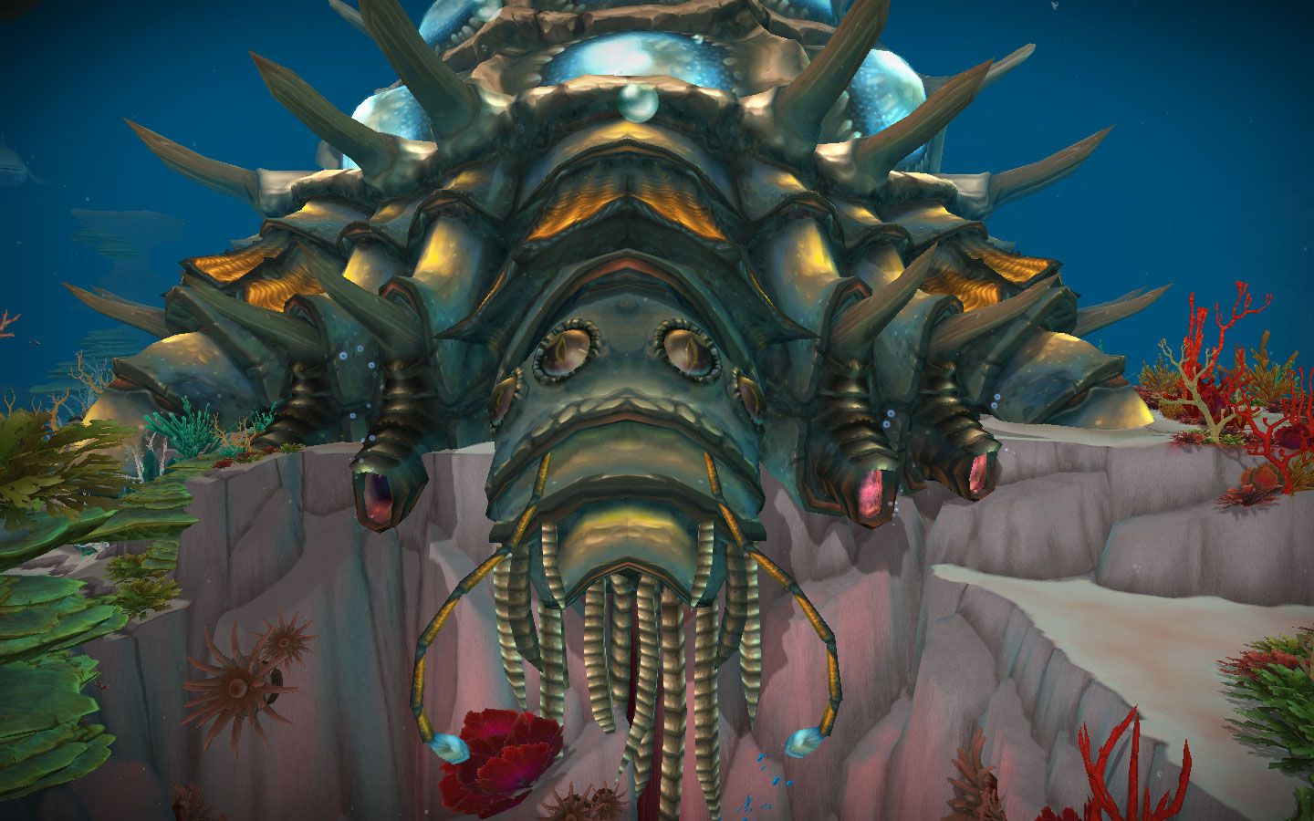Nespirah is an extremely large Ancient,[1][2] found along the Silver Tide Trench in Vashj'ir. She is facing the Glimmerdeep Gorge. She had been put into a torpor and enslaved by the naga. Imprisoned Alliance and Horde slaves mined powerful magic pearls from the inside of the beast.