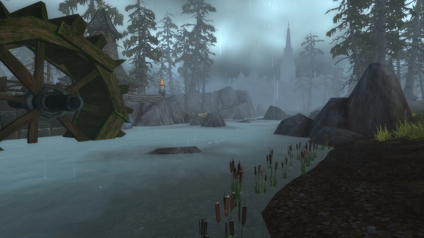 Northgate River is a river found on the Gilnean peninsula. It runs from a waterfall coming down the eastern section of the Greymane Wall, crossing the Northgate Woods and past Emberstone Village, around Gilneas City, to at least Aderic's Repose, and empties into the sea through a narrow area between the two headlands. The Undertaker's Pass runs under it, connecting Greymane Court to Aderic's Repose.