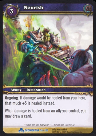 Ongoing: If damage would be healed from your hero, that much +5 is healed instead. When damage is healed from an ally you control, you may draw a card. |
