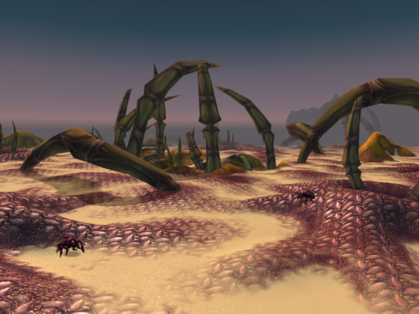 On the surface, the lair is slightly sunk, as if there was a broad river or shallow lake at its location once, overlooking the Un'Goro Crater. The floor is mostly sandy. Here and there large twitching claws are erect, seemingly from large silithid creatures buried in the sand, and where they erect the soil is drenched with silithid goo. Inside the lair beneath the surface, it is like any other silithid hive: Humid, warm and eerie. There are many tunnels connecting the two entrances and the breeding rooms with each other. The walls of the tunnels are coated with silithid acid and decorated with unborn insects.