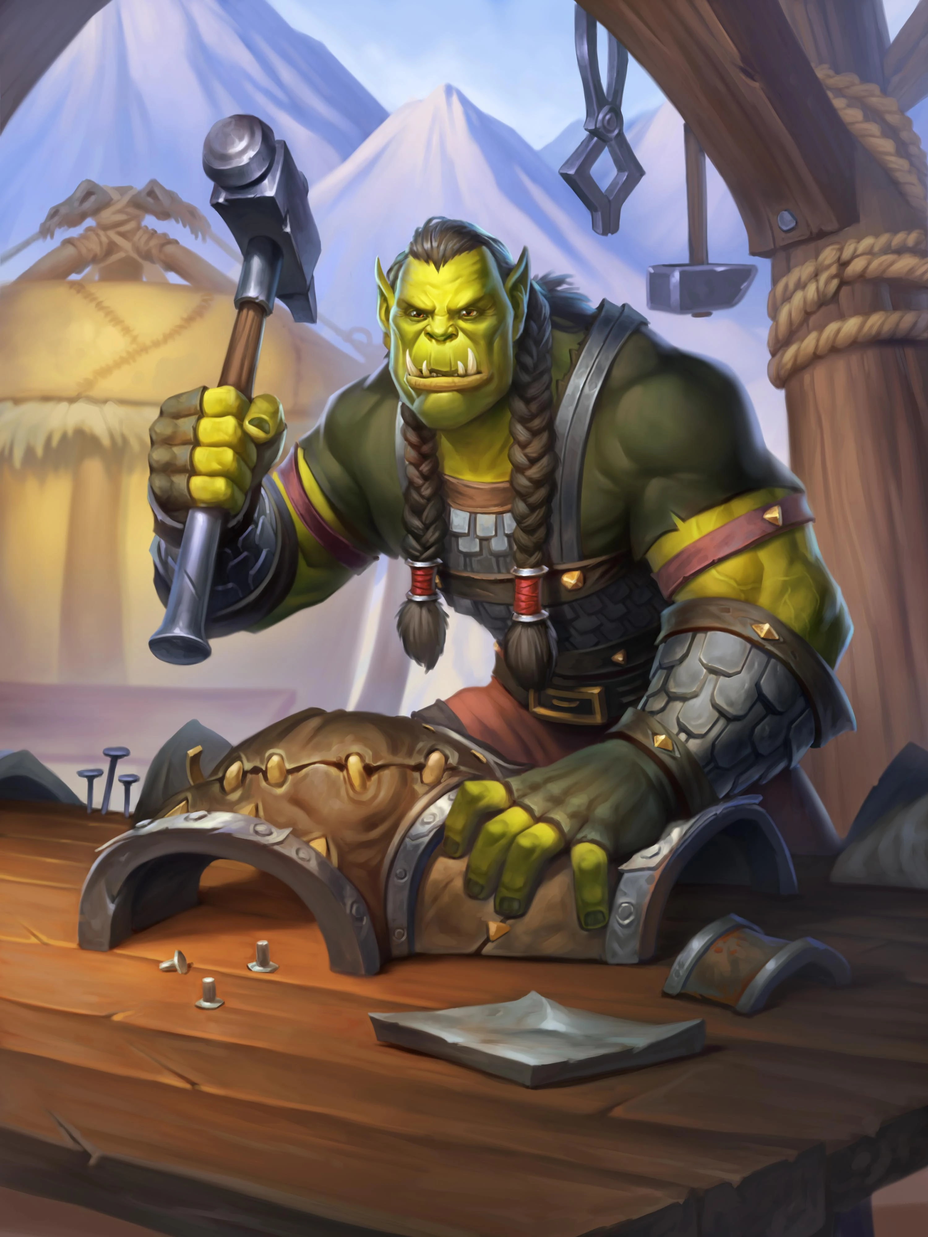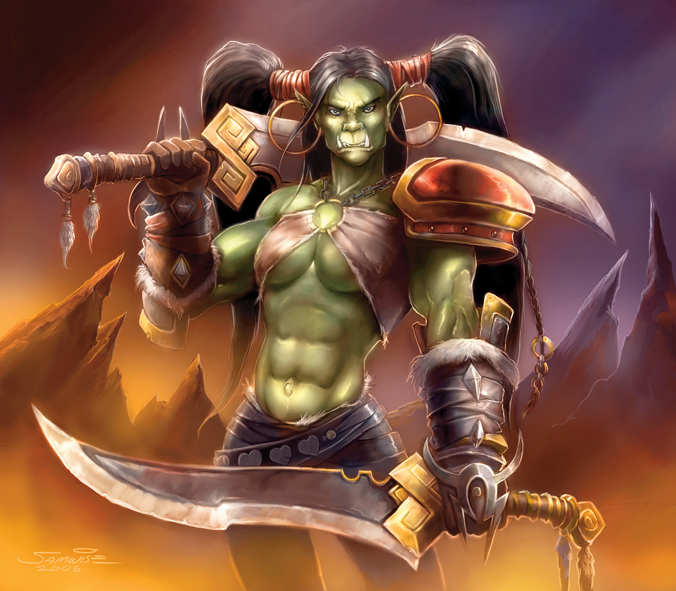 The orcs are a prolific and physically powerful race hailing from the once-lush world of Draenor, now known as the shattered realm of Outland. Originally a shamanistic people cultivating a primitive clan-based society, the orcs were corrupted by Kil'jaeden—a demon lord of the Burning Legion—and manipulated into forming a bloodthirsty Horde that waged war on the peaceful draenei race. Rampant demonic corruption caused the orcs to be filled with bloodlust and turned their normally brown skin into shades of green, culminating with Kil'jaeden's servant Gul'dan convincing the orc chieftains to drink the blood of the demon Mannoroth and thereby enslaving them to the Burning Legion's will. The few orcs who escaped the corruption became known as mag'har ("uncorrupted").