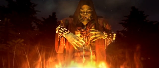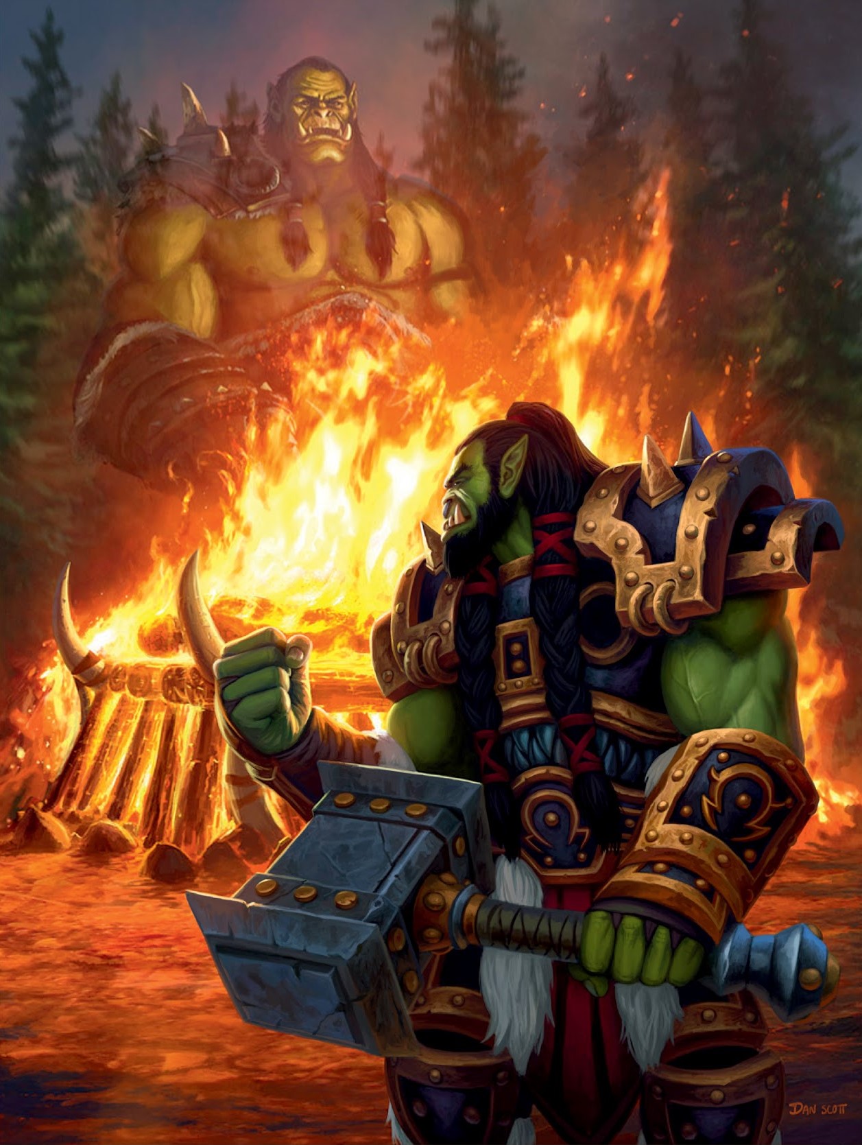 Thrall honors Orgrim Doomhammer at the fallen orc's funeral pyre.