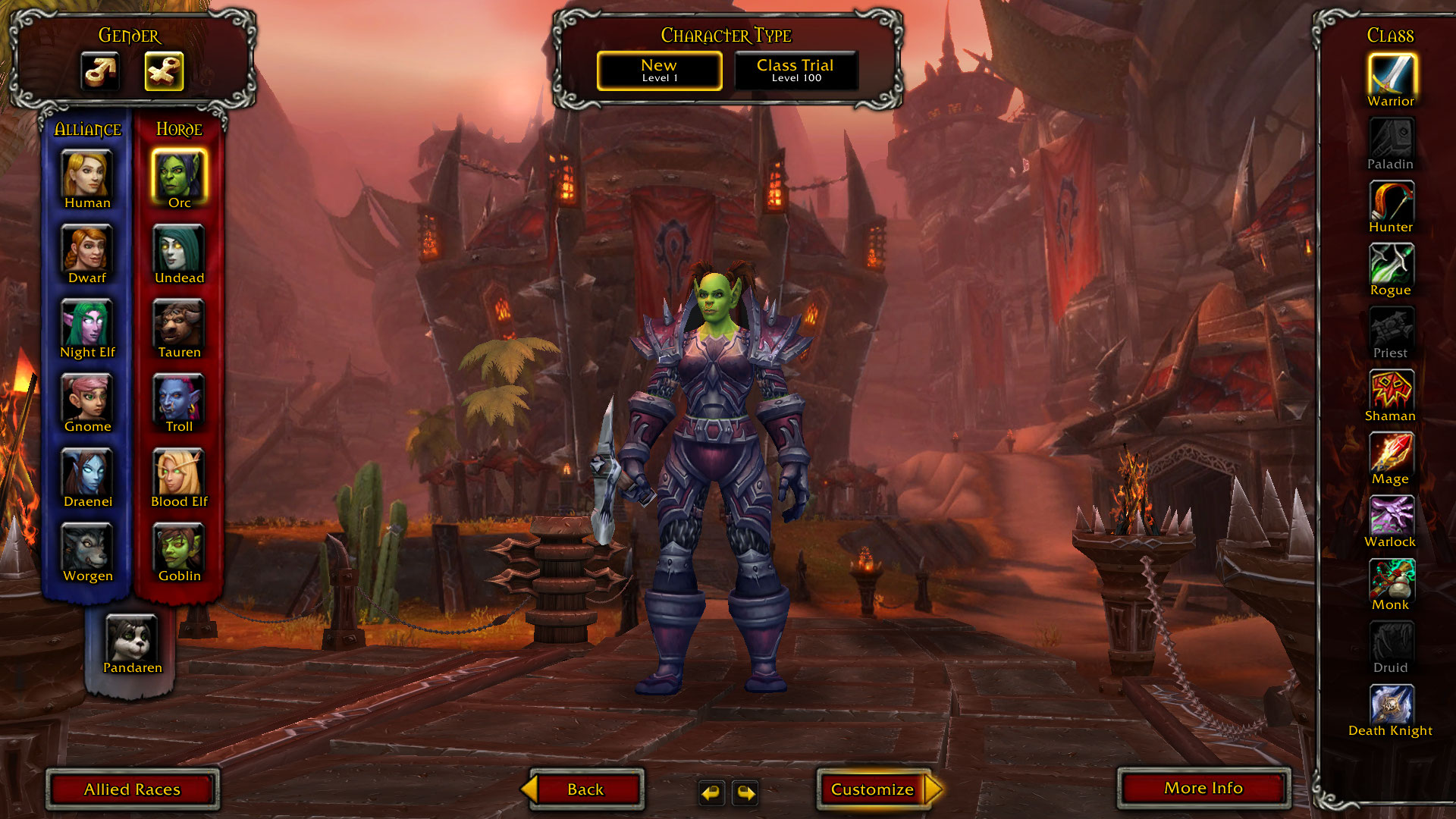 Long ago, the orcish horde was corrupted by the Burning Legion and lured to the world of Azeroth. For generations, the orcs made war upon the human kingdoms of Stormwind and Lordaeron. Though the Horde was ultimately defeated, a visionary young warchief named Thrall rose to lead his people in their darkest hour. Under Thrall's rule, the orcs freed themselves from the chains of demonic corruption and embraced their shamanistic heritage. After years of wandering, the orcs founded their own kingdom in the harsh wastelands of Durotar. Based in the warrior city of Orgrimmar, they stand ready to destroy all who would challenge their supremacy. As a proud defender of Durotar, it is your duty to crush the enemies, both seen and unseen, for the nefarious agents of the Burning Legion still wander the land.
