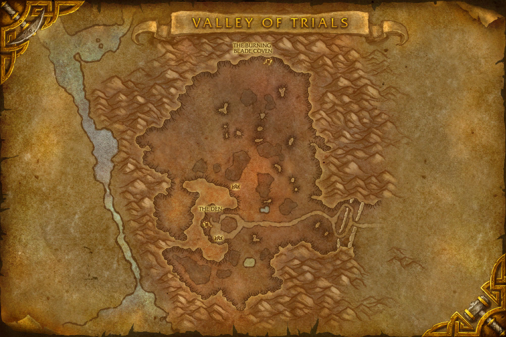 The orcish starting experience takes place in Valley of Trials, in southwestern Durotar. In this questline, players are sent out into the Valley to collect various materials and kill various enemies to prove themselves to Gornek. After