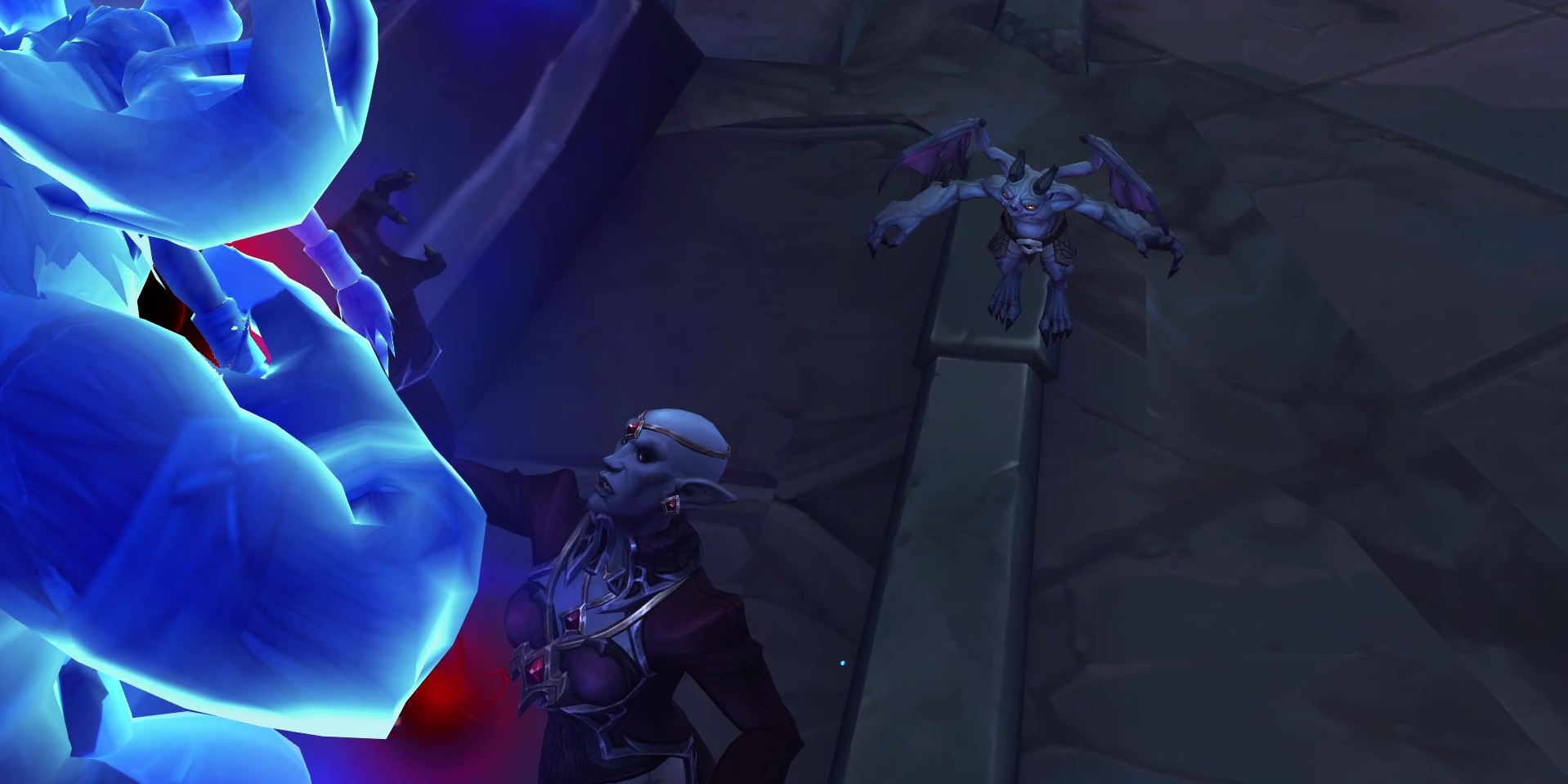 Up the stairs to the north, where the terrain is crumbling into the Maw: