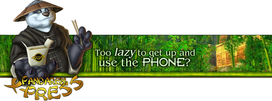 Imagine you are on an instance run in Maraudon, Dire Maul, or even Blackrock Spire. Two long hours into the dungeon and you suddenly notice the hunter in your group feeding his pet. That triggers a rumbling in your belly, which reminds you that you haven't eaten anything all day! How can you satisfy your craving without abandoning your group?! Before, there was nothing for you to do but suffer in hunger. Now, thanks to Pandaren Xpress®, creators of low-priced gourmet meals, you no longer have to leave the group for a food break. In less time than it takes your party's casters to regain mana (even less if you don't have a mage), you can order Chinese take-out from the comfort of your chair! No more tedious walking over to the telephone! No more arduous pushing of unfamiliar phone numbers!