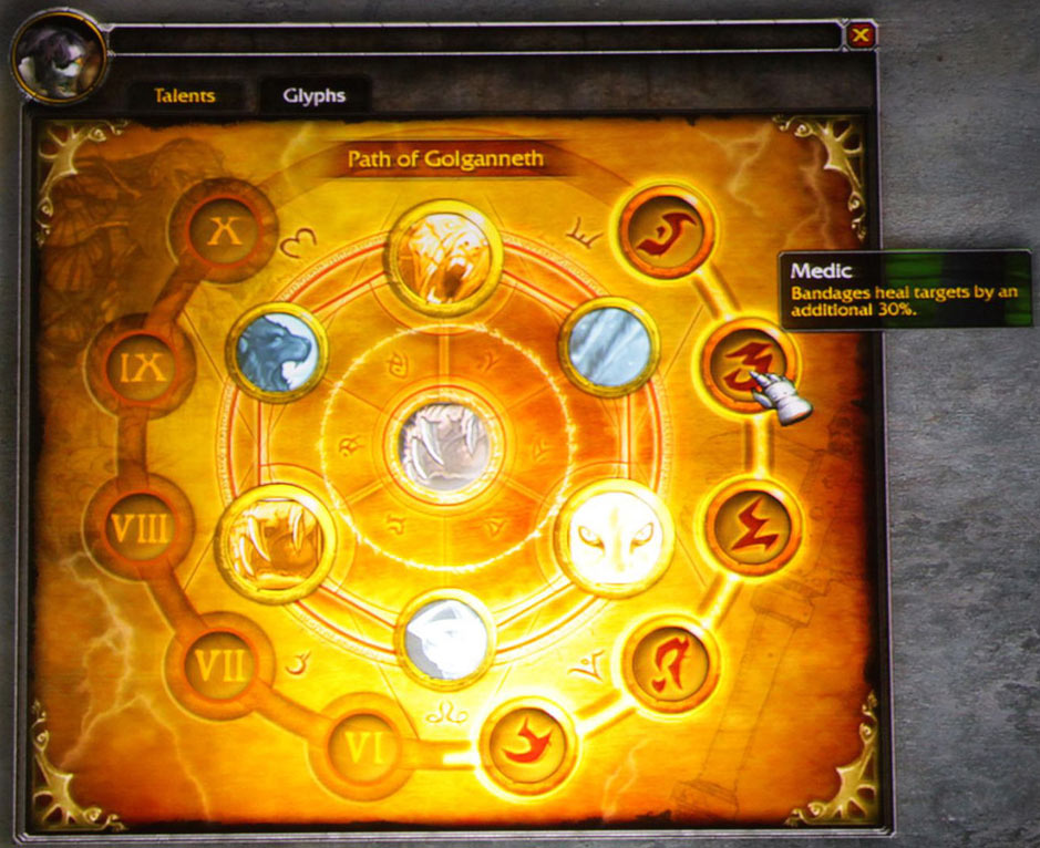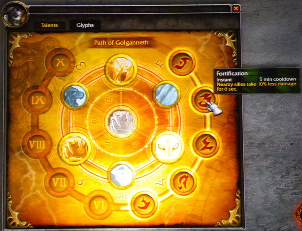 Players could earn progress down any of these paths by doing things such as questing, raiding, PvP, trade skills, etc., with a possible weekly cap for maximum progress. Over time, characters would be able to unlock new ancient glyphs that will greatly benefit them. Each path consisted of 10 ranks, with ten slots numbered from I to X; at each rank players would be presented with a selection of two to three different ancient glyphs from which to fill the slot. This system was designed to provide a 20% character-power increase over the course of the expansion and would be compatible with dual specialization.[1]
