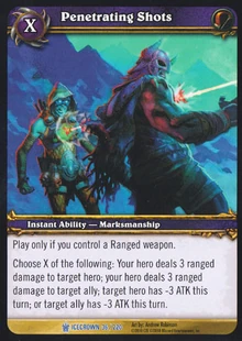 Play only if you control a Ranged weapon. Choose X of the following: *Your hero deals 3 ranged damage to target hero; *Your hero deals 3 ranged damage to target ally; *Target hero has -3 ATK this turn; *Or target ally has -3 ATK this turn. |