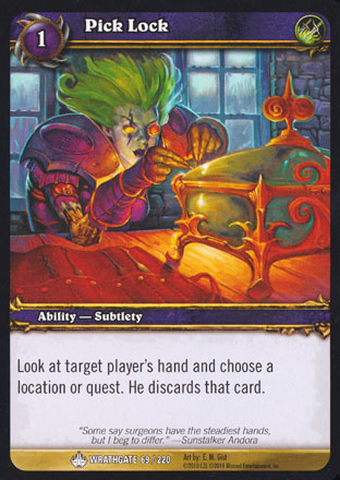 Look at target player's hand and choose a location or quest. He discards that card. |