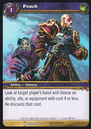 Look at target player's hand and choose an ability, ally, or equipment with cost 4 or less. He discards that card. |