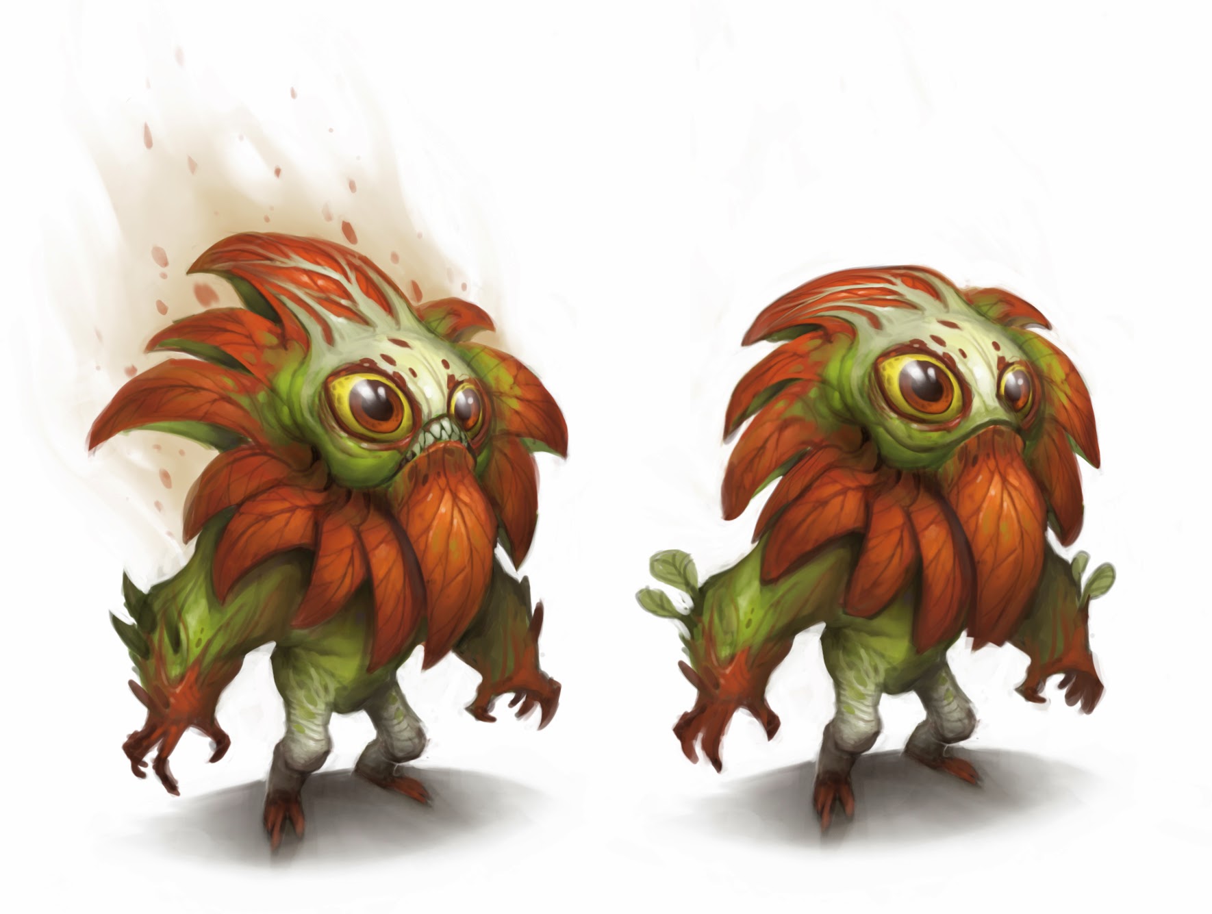 Podlings appear in a wide range of bright and eye-catching colours. Lively creatures with an aggressive demeanour, podlings often use simple spear-like weapons — crudely adorned with thorns and twigs[4] — to attack enemies. Usually found in groups, these tiny warriors do not seem afraid of taking on prey several times larger than themselves. Podlings are capable of overwhelming and devouring humans and other larger humanoids.[5] Podlings also lay traps for prey such as squirrels, rooting them in place until the podlings return.[6]