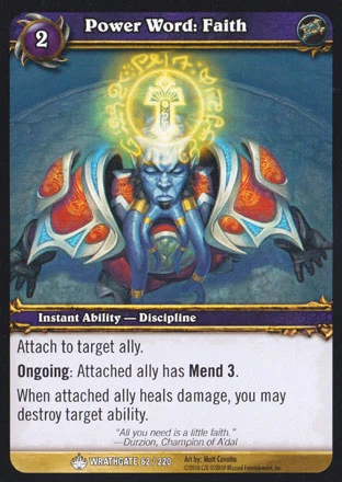 Attach to target ally. Ongoing: Attached ally has Mend 3. When attached ally heals damage, you may destroy target ability. |