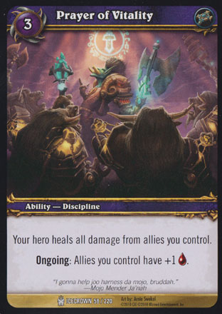 Your hero heals all damage from allies you control. Ongoing: Allies you control have +1 Health. |