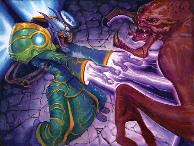 Priest prestige class in Warcraft: The Roleplaying Game. Art later used for the Warrior character class in World of Warcraft: The Roleplaying Game.