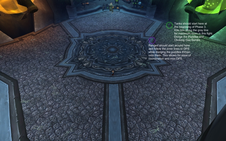 To maximize DPS time, Putricide stays near the green ooze spawn point. Ranged stack opposing the oozes, at max range, while spreading out to minimize the malleable goo effect during Phase 2 & 3. With this positioning, melee can switch from the boss to the green add very quickly.