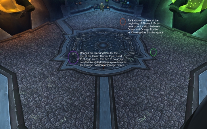 If Phase 1 was ended with no oozes, there's a solid 20+ seconds to DPS the boss uninterrupted. Phase 2 is identical to Phase 1 except that it requires higher raid awareness. The boss has to be moved when he drops Choking Gas Bombs (orange vials on the ground), and ranged must avoid Malleable Goo at all costs. When using BigWigs or Deadly Boss Mods, it's a good idea to stick to its advice - don't move if the mod doesn't tell you to do so. The two positions that the tank has established should flow perfectly from here on out. Whenever he drops a choking gas bomb, move to the other position. When the green ooze comes out, he should be right on top of it. When the orange ooze comes out, he should be near the table.