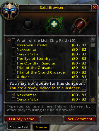 Screenshot taken in patch 3.3.0 showing if you are saved to a raid, you cannot sign up for it again.