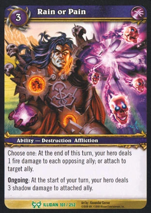 Choose one:At the end of this turn, your hero deals 1 fire damage to each opposing ally; or attach to target ally. Ongoing: At the start of your turn, your hero deals 3 shadow damage to attached ally. |