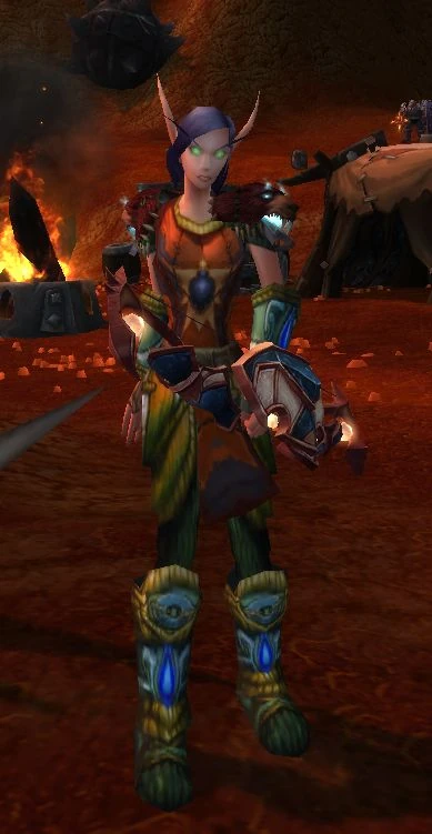 Rainiara the Kingslayer is a blood elf fighting Iron Horde Grunts alongside many others at the Dark Portal in the Blasted Lands and Tanaan Jungle. She died after the portal was destroyed.