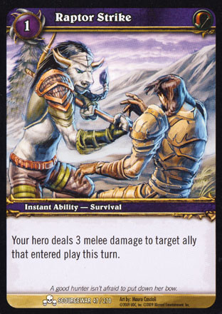 | Rules | Your hero deals 3 melee damage to target ally that entered play this turn. |