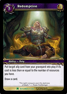 Put target ally card from your graveyard into play if its cost is less than or equal to the number of resources you have. Draw a card. |