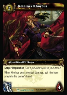 Scryer Reputation (Can't put Aldor cards in your deck.) When Khorbus deals combat damage, put him from play into his owner's hand. |