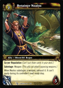 Scryer Reputation (Can't put Aldor cards in your deck.) Sabotage: Weapon (This ally can attack opposing weapons.) When Nealos sabotages a weapon, exhaust it. It can't ready during its controller's next ready step. |