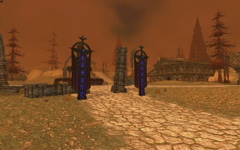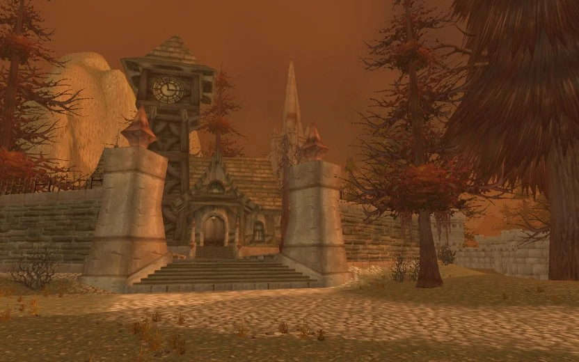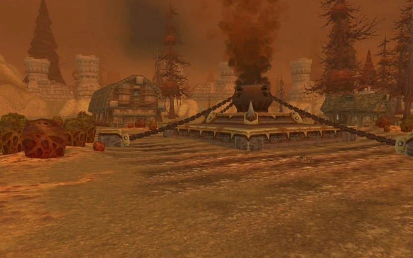 Throughout the ruins, the banner of the Knights of the Ebon Blade (rather than that of the Scourge) can be seen in certain areas, such as the courtyard of New Avalon and outside the ruined Scarlet Hold. The ruins of these last human settlements in the Eastern Plaguelands serve only as a sad reminder of what the Scourge can do to its enemies. The Havenshire Farms contains a plague cauldron put in place by one of them, and it has turned what used to be pumpkins into hideous mounds of unnatural flora that look like they are breathing. The trees, already dying before the coming of Acherus, are rotting away, some of them already mutating. King's Harbor is deserted, the last ship having left shortly before the massacre of almost the entire Scarlet Crusade. Some ruined buildings still contain a cozy fire, only reinforcing how recently the Scarlet refuge was ended. Corpses still litter the ground in the ruins of New Avalon and Havenshire, and Death's Breach rises above the ruins at the north side, with Acherus still floating overhead, and the banner of the Ebon Blade placed all over the campsites. The whole area is covered in a veil of reddish-orange smog, like the majority of Eastern Plaguelands.
