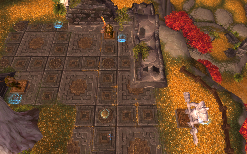 Head up the path to the north. In the center of the eastern ruins area is the Ancient Mogu Artifact. In the general vicinity are blue runes on the ground. Step on them to deactivate them.