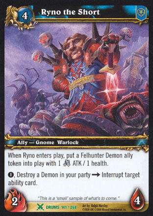 When Ryno enters play, put a Felhunter Demon ally token into play with 1 Melee ATK / 1 health. (1), Destroy a Demon in your party → Interrupt target ability card. |